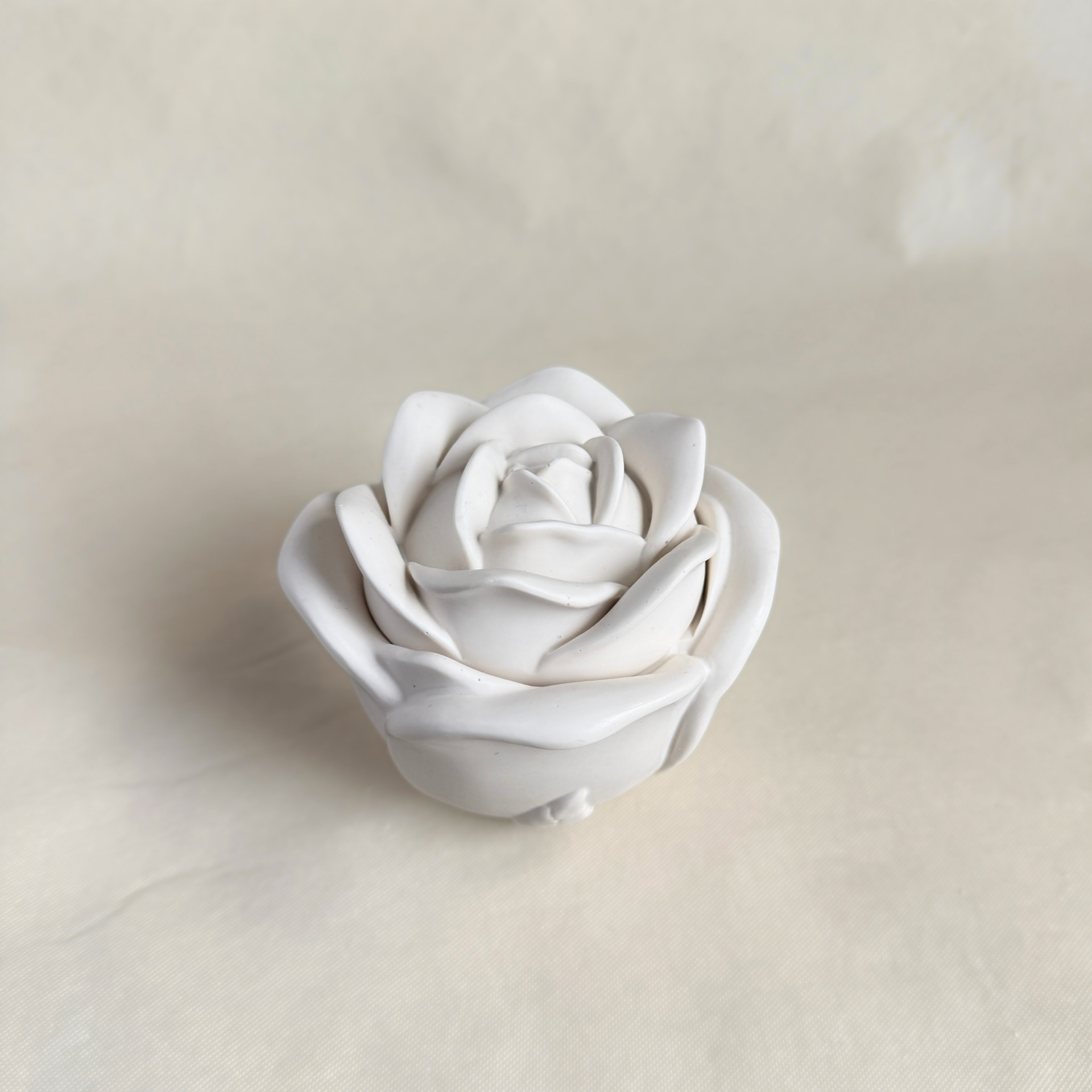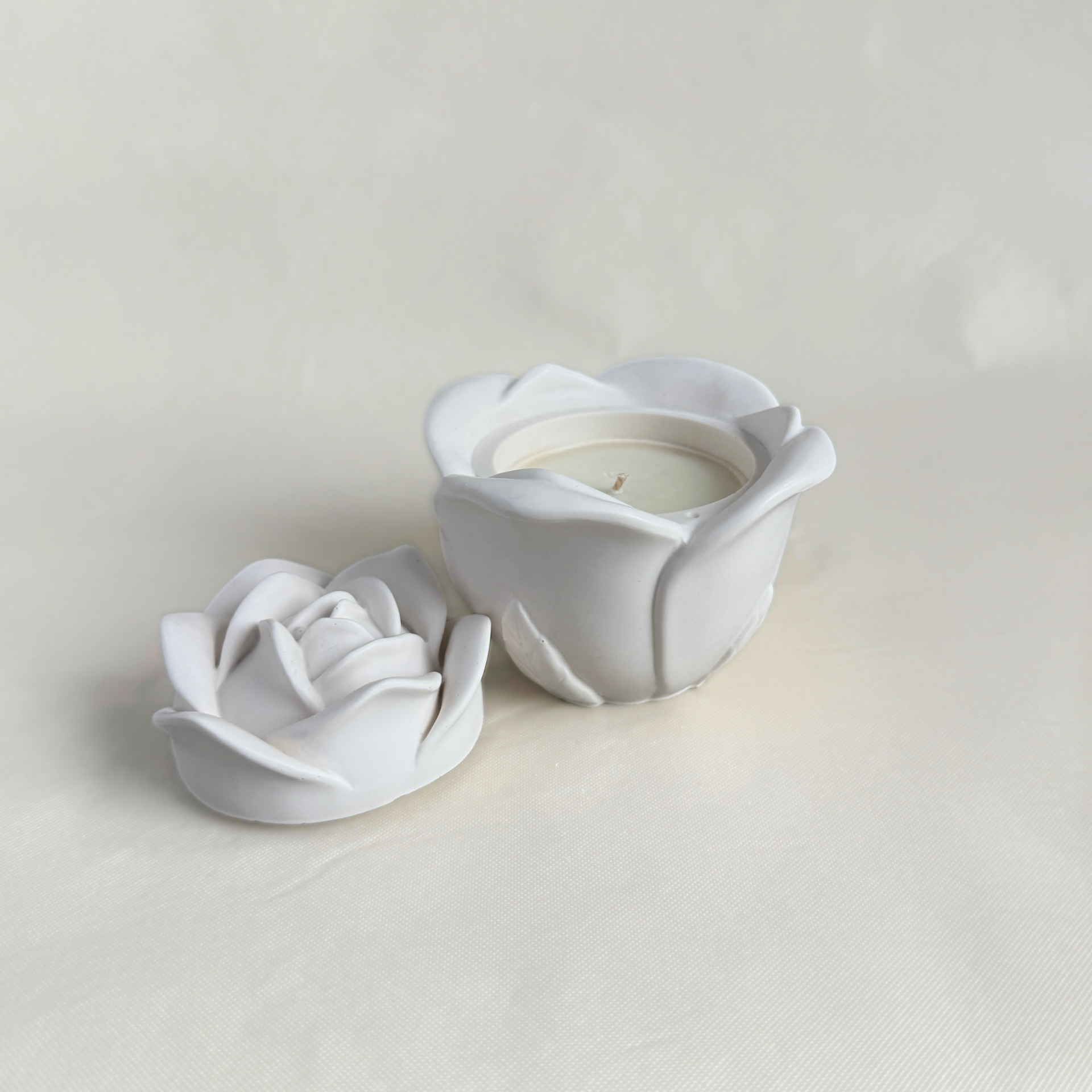 Elke kaars is gegoten in een elegante houder in de vorm van een roos, gemaakt van acrylhars in een zachte, natuurlijke beige tint.