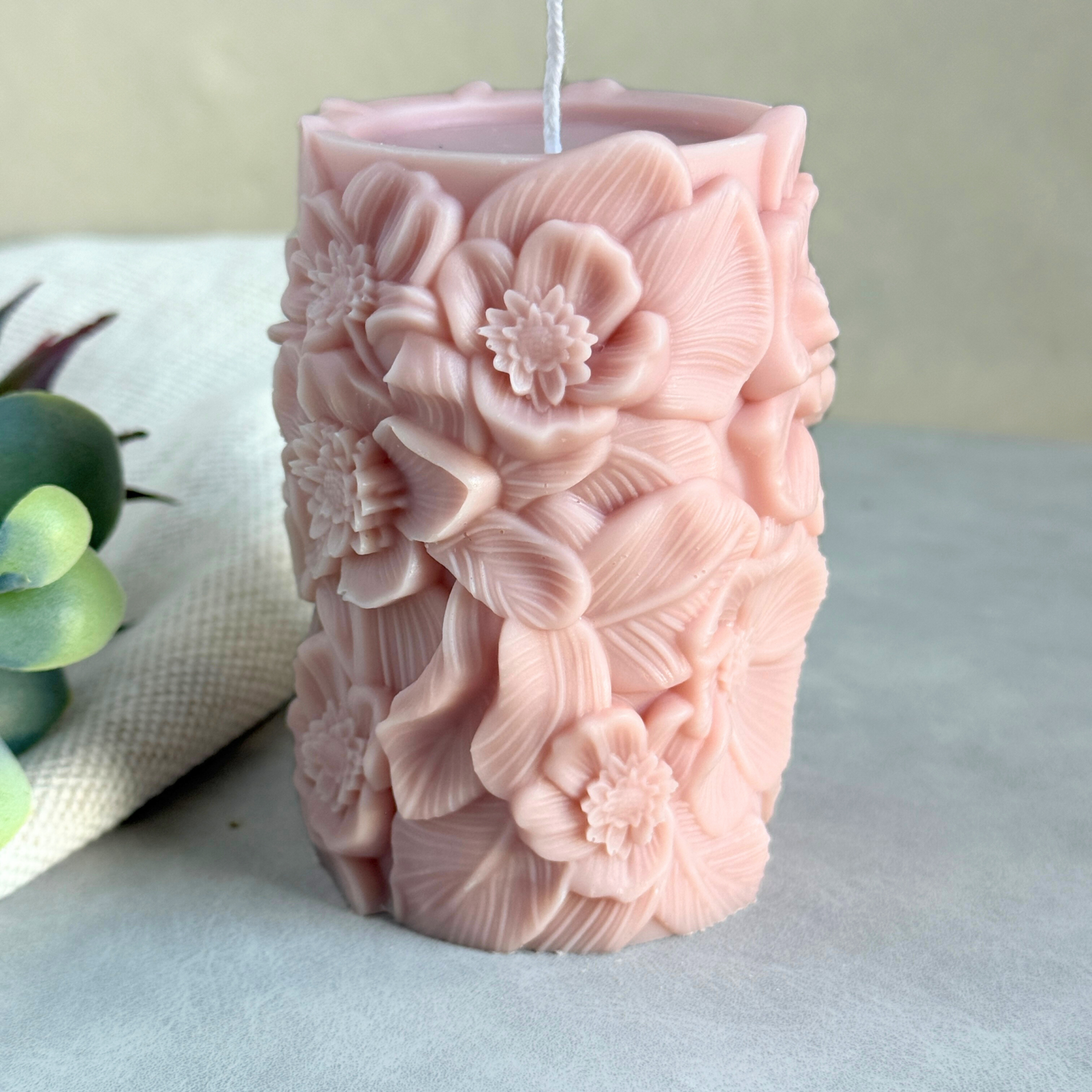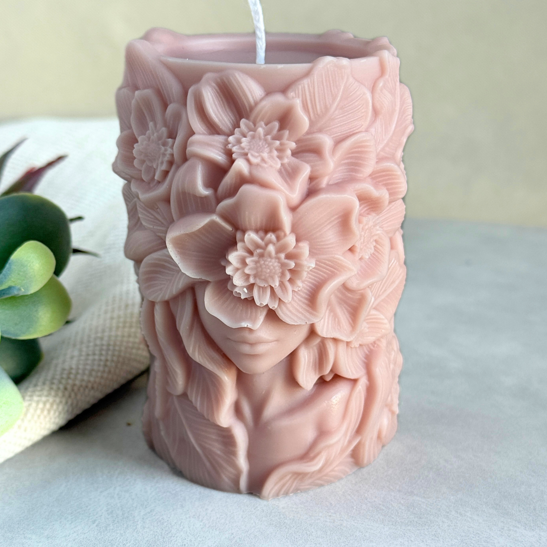 Deze bijzondere stompkaars is een echte blikvanger: een artistieke sculptuur met 3D bloemen en het gezicht van een vrouw. Met de hand gegoten uit natuurlijke koolzaadwas, straalt deze kaars rust, elegantie en ambacht uit.