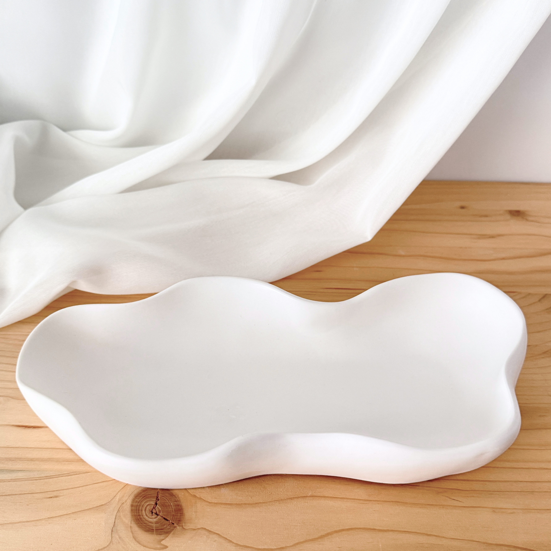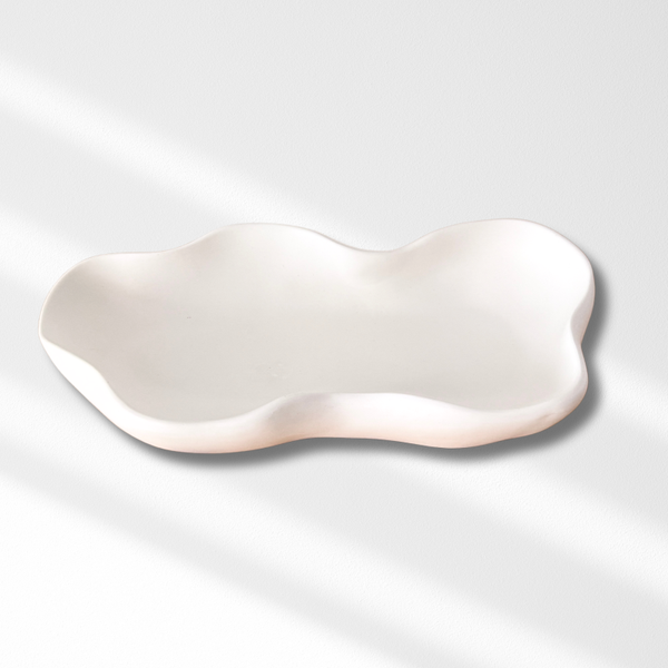 Deze prachtige handgemaakte schaal is vervaardigd uit hoogwaardig porseleinen gips en straalt rust, eenvoud en ambacht uit. De onregelmatige, golvende rand geeft elk stuk een organisch en artistiek karakter.